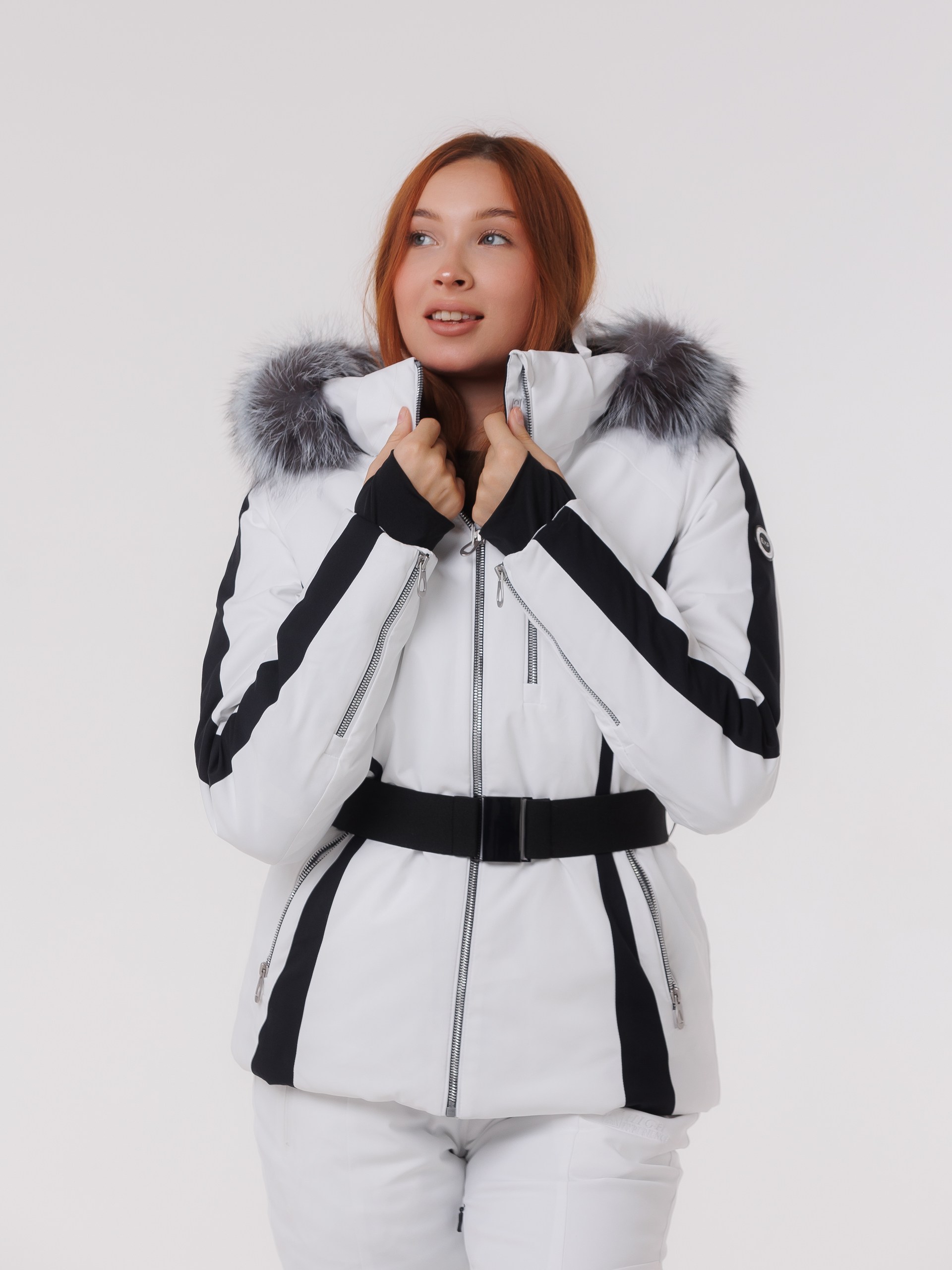 Куртка High Experience создана для зимы, в которой хочется двигаться, а не подстраиваться под погоду. Это модель для активного образа жизни, где спорт, город и дорога легко складываются в один день. Посадка приталенная и выразительная: куртка подчёркивает талию за счёт широкого пояса, при этом остаётся визуально собранной и устойчивой в движении. Длина закрывает линию бёдер, создавая ощущение баланса и защищённости. В динамике силуэт выглядит стройно и аккуратно, без лишнего объёма. Визуально модель строится на контрасте белого и чёрного. Чёрные вставки по рукавам и корпусу формируют чёткие вертикали, усиливая спортивный характер. Центральная молния подчёркивает симметрию, а карманы на молниях добавляют функциональный ритм образу. Объёмный капюшон с меховой отделкой делает верх визуально мягче и добавляет зимнего настроения. Манжеты с удлинённой формой выглядят плотно и аккуратно.