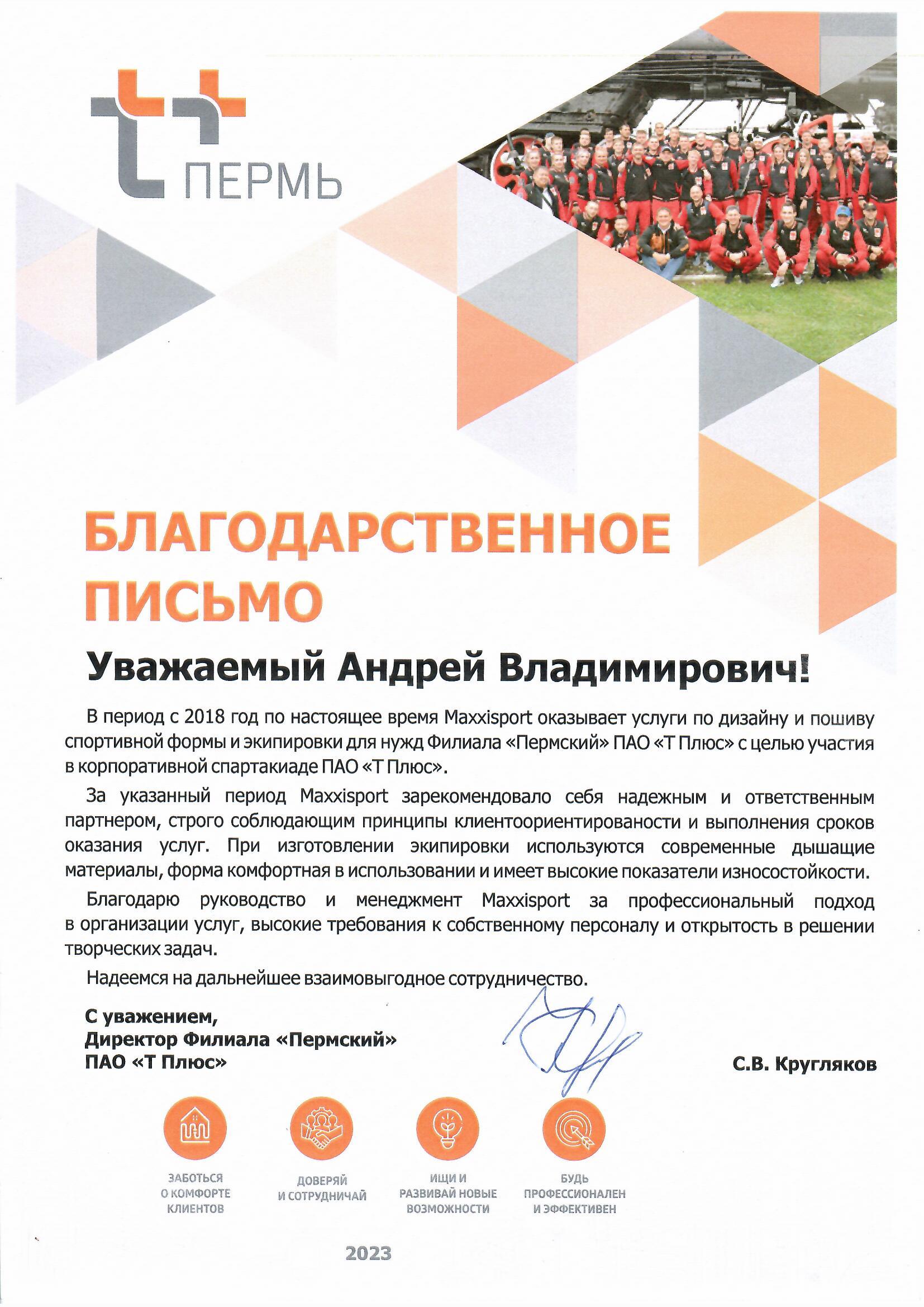 Письмо от компании «Т Плюс», отмечающее многолетнее сотрудничество, высокое качество экипировки и надёжность MAXXISPORT как партнёра.