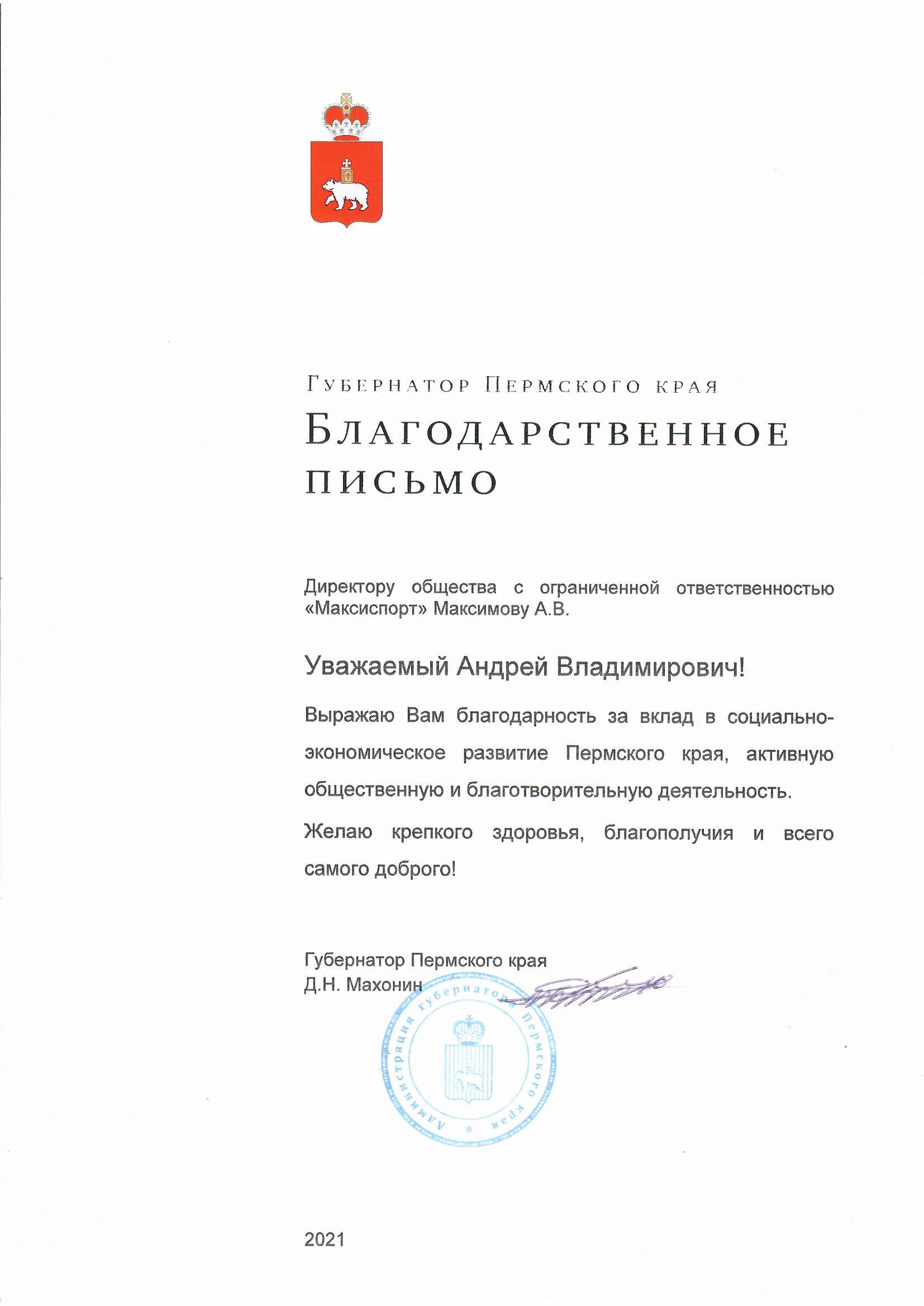 Официальная благодарность за вклад компании в социально-экономическое развитие региона и активную общественную деятельность.