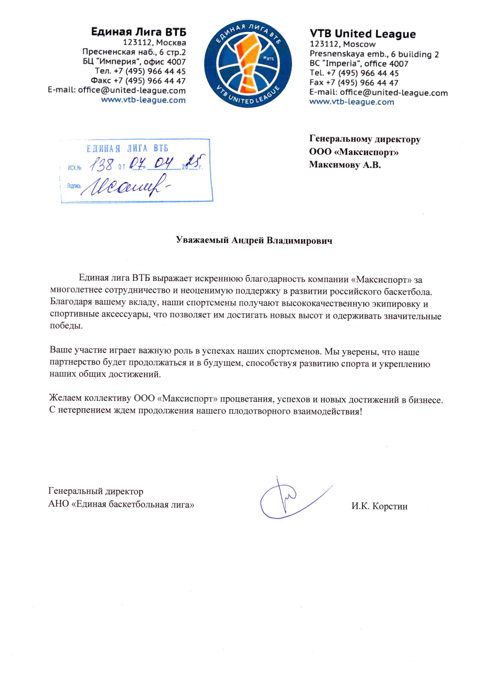 Письмо от Единой лиги ВТБ, подтверждающее многолетнее сотрудничество и вклад MAXXISPORT в развитие российского баскетбола и оснащение спортсменов качественной экипировкой.